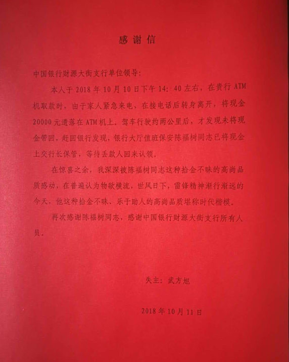 2018年10月10日下午14:40左右,在中行ATM機(jī)取款時(shí),由于家人緊急來電,在接電話后轉(zhuǎn)身離開,將現(xiàn)金20000元遺落在ATM機(jī)上。駕車行駛約兩公里后,才發(fā)現(xiàn)未將現(xiàn)金帶回,趕回銀行發(fā)現(xiàn),銀行大廳值班保安陳福樹同志已將現(xiàn)金上交行長保管,等待丟款人回來認(rèn)領(lǐng)。為此,該客戶特意送來感謝信及錦旗一面,表示感謝。陳福樹同志拾金不昧的精神體現(xiàn)出了泰山聯(lián)合保安全心全意為客戶單位做好服務(wù)的優(yōu)良作風(fēng)。經(jīng)公司研究決定,給予保安隊(duì)員陳福樹同志通報(bào)表揚(yáng),獎勵現(xiàn)金400元,以資鼓勵。