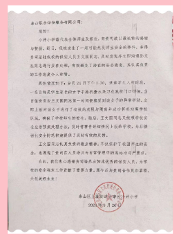 2024年9月24日下午1:30分,適逢學(xué)生入校時(shí)段,一名自稱是學(xué)生家長(zhǎng)的女子手持折疊水果刀在我校門口徘徊。當(dāng)是值班保安員王文國(guó)同志第一時(shí)間便察覺到該女子的異常舉動(dòng),立即上前對(duì)該女子進(jìn)行了有效的勸阻與隔離并成功將其勸離學(xué)校區(qū)域,確保了學(xué)校師生的安全。隨后,王文國(guó)同志又按照學(xué)校安全應(yīng)急預(yù)案處理辦法,及時(shí)將事件詳細(xì)情況上報(bào)給學(xué)校及公司,為后續(xù)強(qiáng)化安全防范措施提供了及時(shí)有效的反饋。