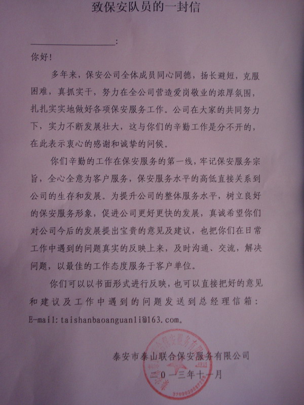 近期,為提升公司的整體服務水平,公司開展了征求隊員意見及建議的活動,希望隊員對公司今后的發(fā)展提出寶貴的意見和建議。公司抽派專人走訪各駐勤點保安隊員發(fā)放信函,以此形式反饋隊員思想動態(tài),并鼓勵各駐勤單位保安員積極工作,增強服務意識、安全意識,進一步提升公司服務水平。